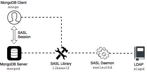 LDAP authentication with SASL means that both the client and the server establish a SASL session using the SASL library. Then authentication (bind) requests are sent to the LDAP server through the SASL authentication daemon (saslauthd) that acts as a remote proxy for the mongod server.